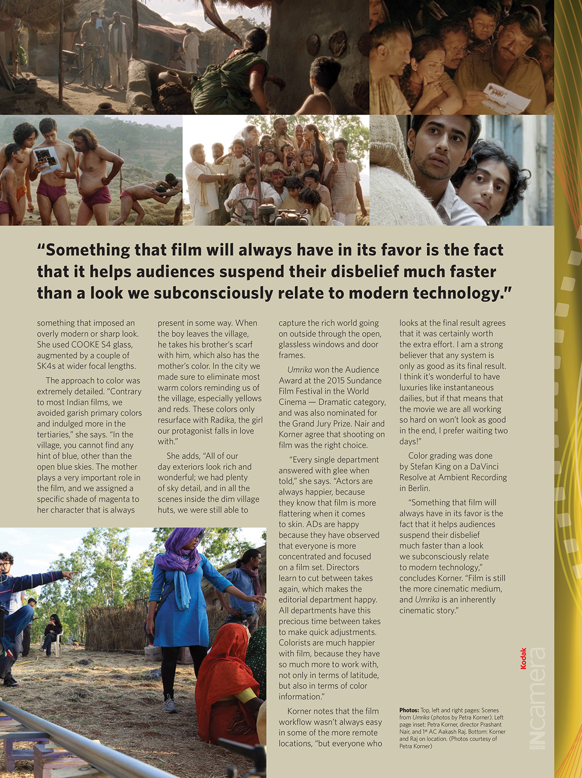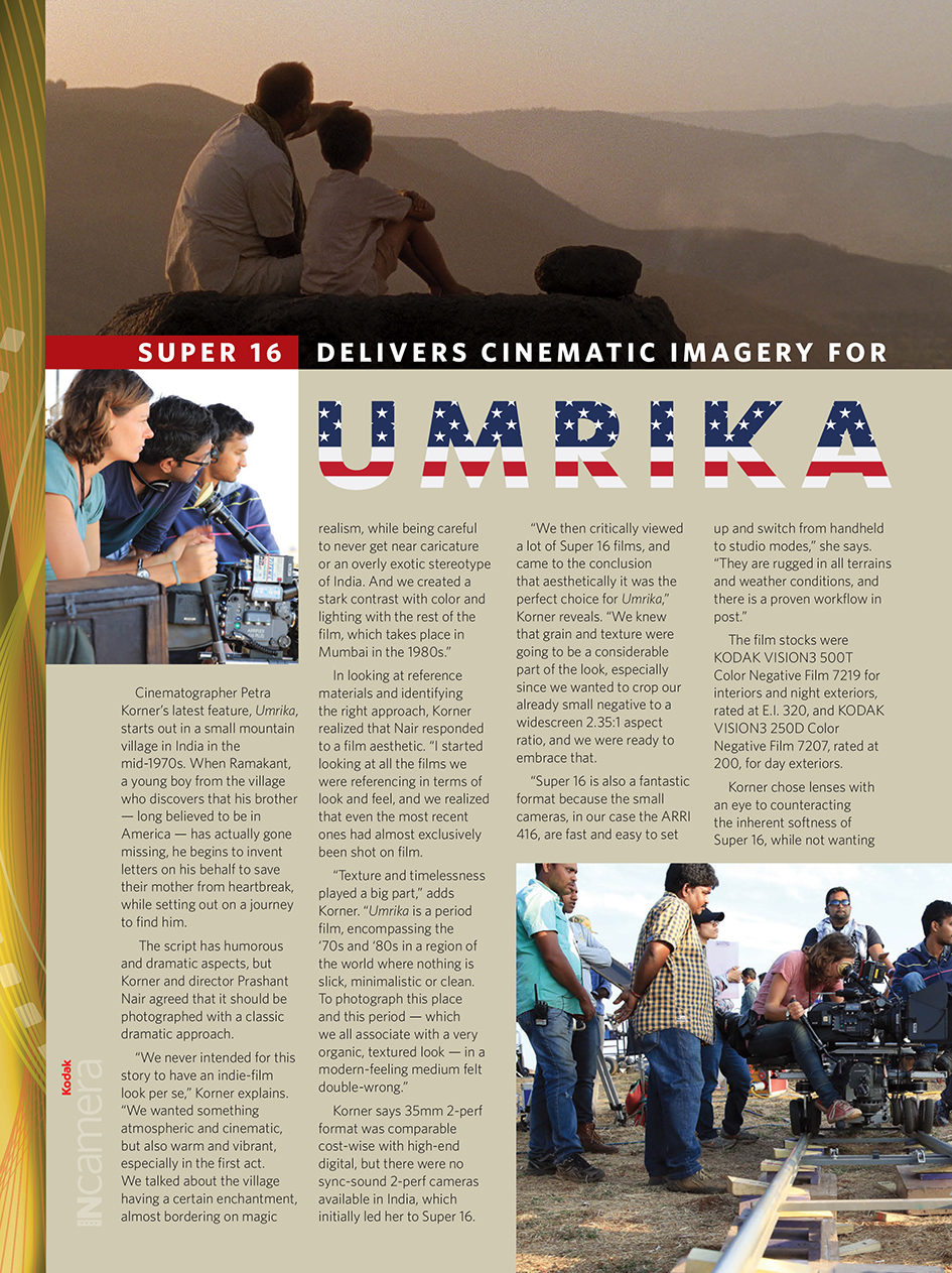 A Terre di Cinema 2015 Petra Korner presenterà il suo ultimo film Umrika (2015), girato in India per la regia di Prashant Nair. A proposito di questo lavoro, potete leggere l’intervista rilasciata da Petra Korner a Kodak in Camera, sul numero di Aprile 2015 de American Cinematographer Magazine: