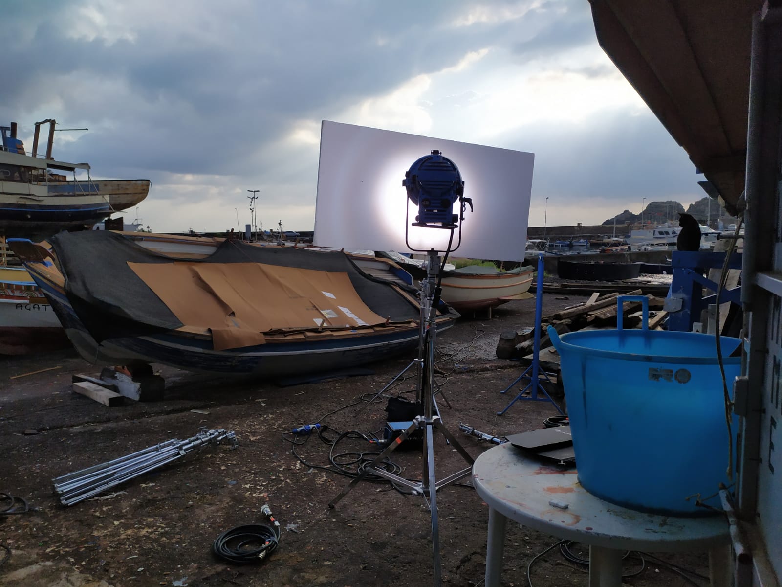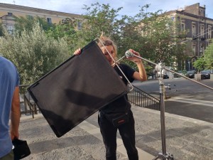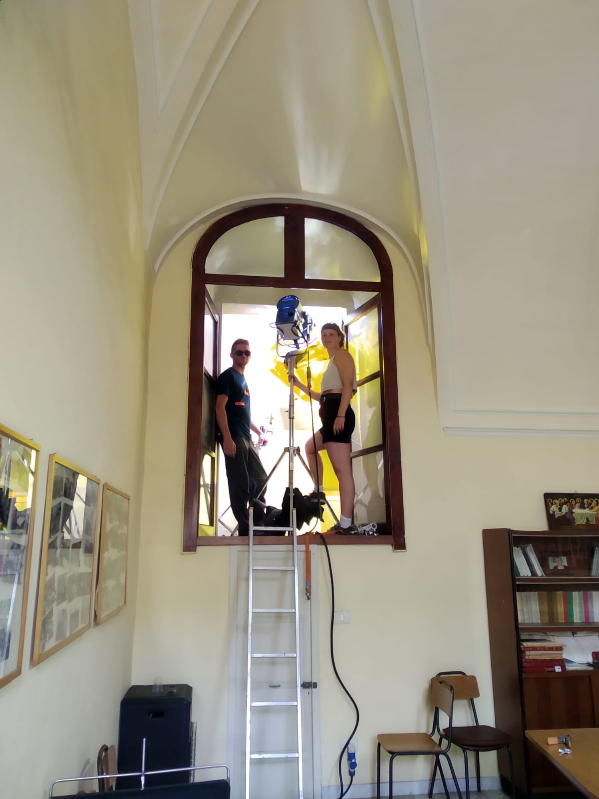 CineCampus shooting: Camera tutor Paolo Catalano (Italy) and Winnie Brook Young (UK) rigging lights.