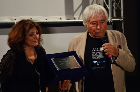 Laura Delli Colli, Chairman of SNGCI – the Italian Union of Cinema Journalists and Critics, awards Luciano Tovoli (AIC, ASC) with the Special Silver Ribbon Award at Terre di Cinema 2014