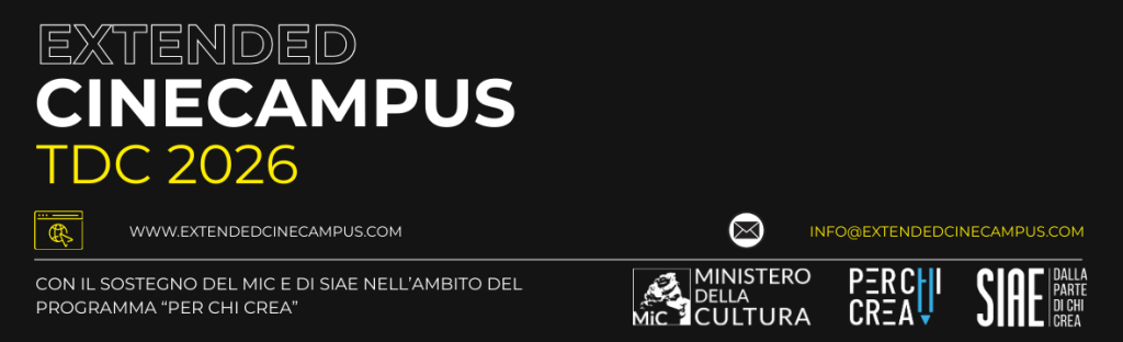 Extended CineCampus TDC 2026 è la residenza artistica internazionale di alta formazione e produzione cinematografica che promuoviamo con il sostegno del MiC e di SIAE nell’ambito del programma “Per Chi Crea”.